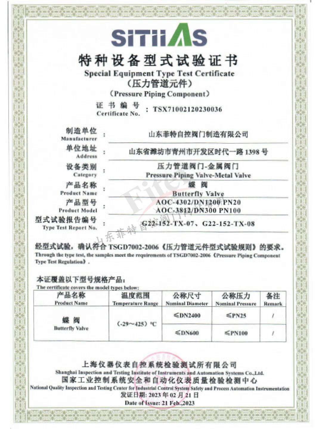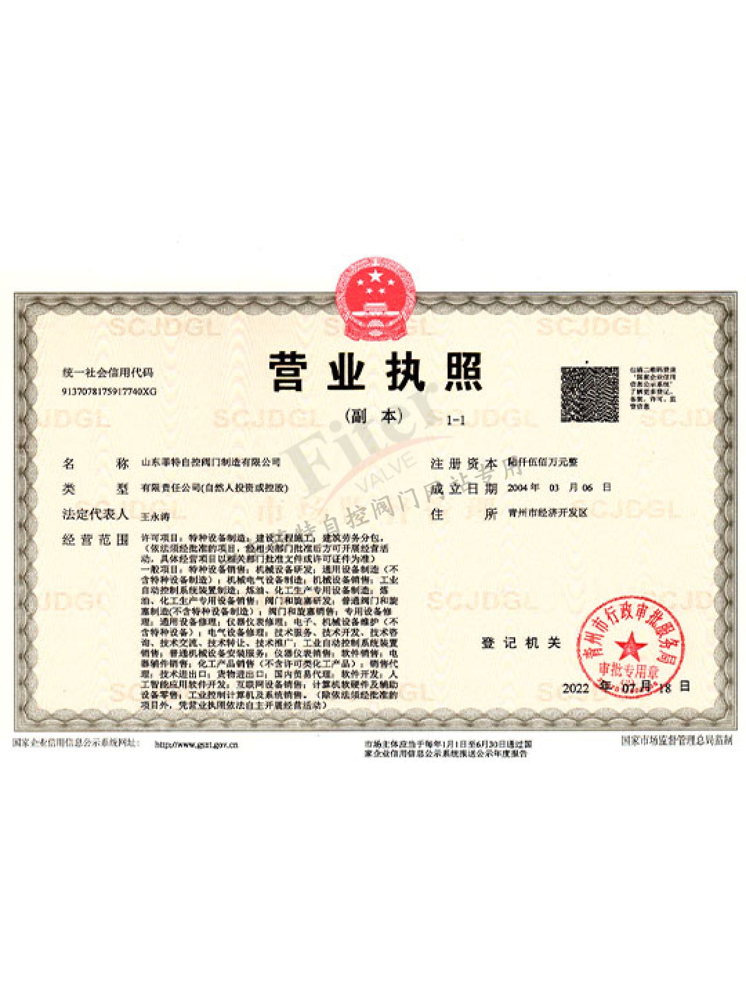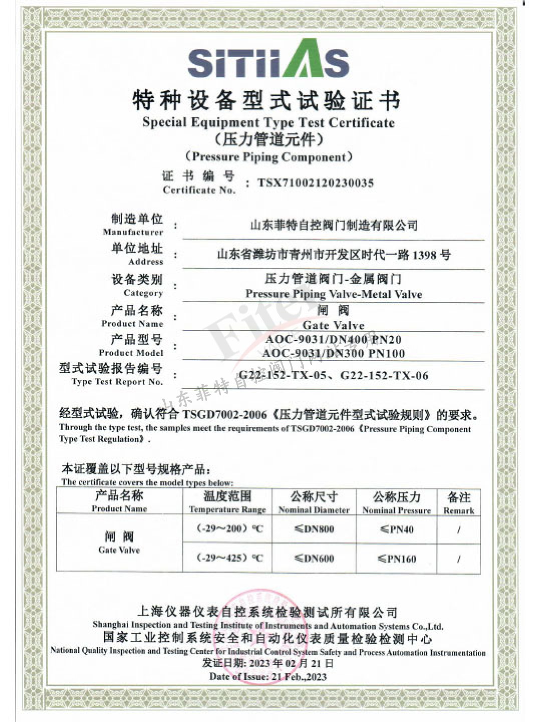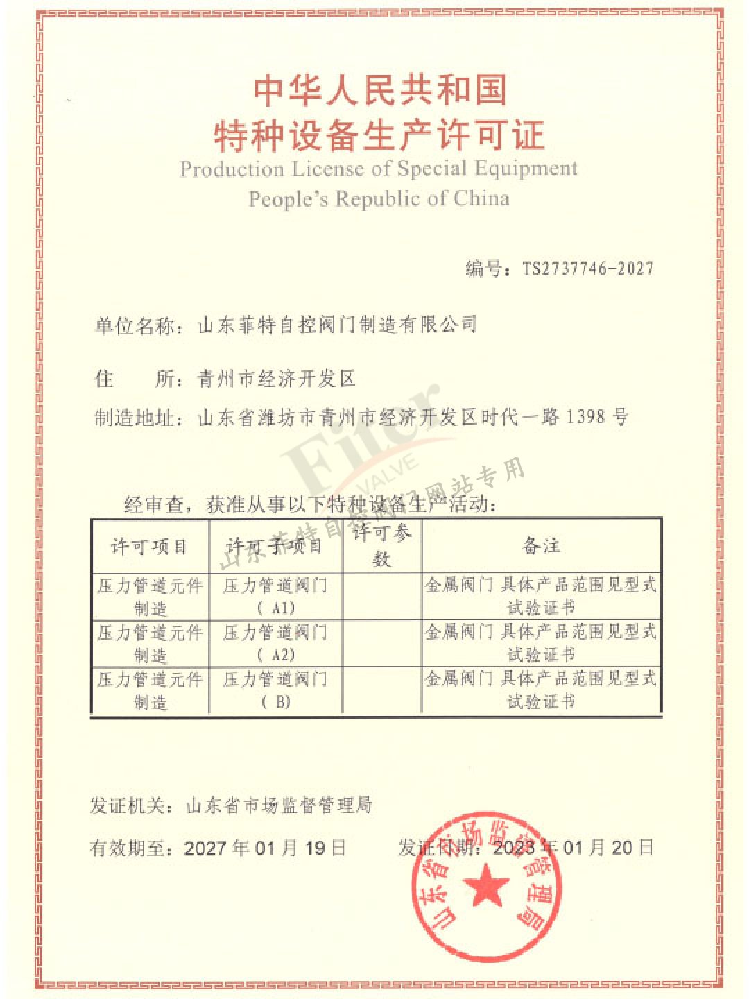 公司目前有30多項發明專利和實用新型專利,經過多年發展建立了一套完整的符合《特種設備生產和充裝單位許可規則》的壓力管道元件制造管理體系,并取得國家市場監管總局頒發的TS特種設備制造許可A1級證書,許可項目為調節閥、閘閥、球閥、排污閥、蝶閥。公司取得ISO9001質量管理體系認證,ISO14001&45001環境與職業健康安全體系認證。
