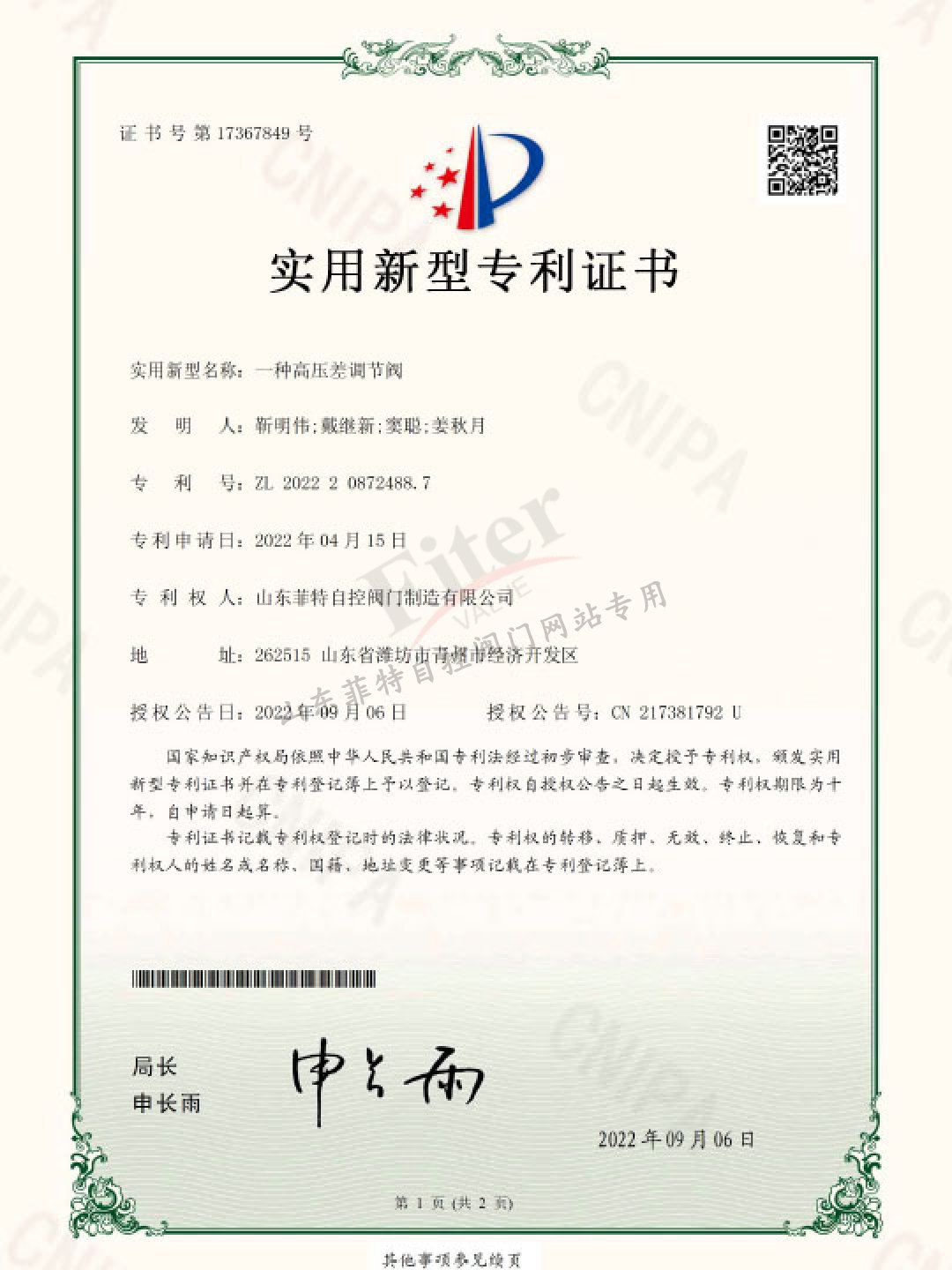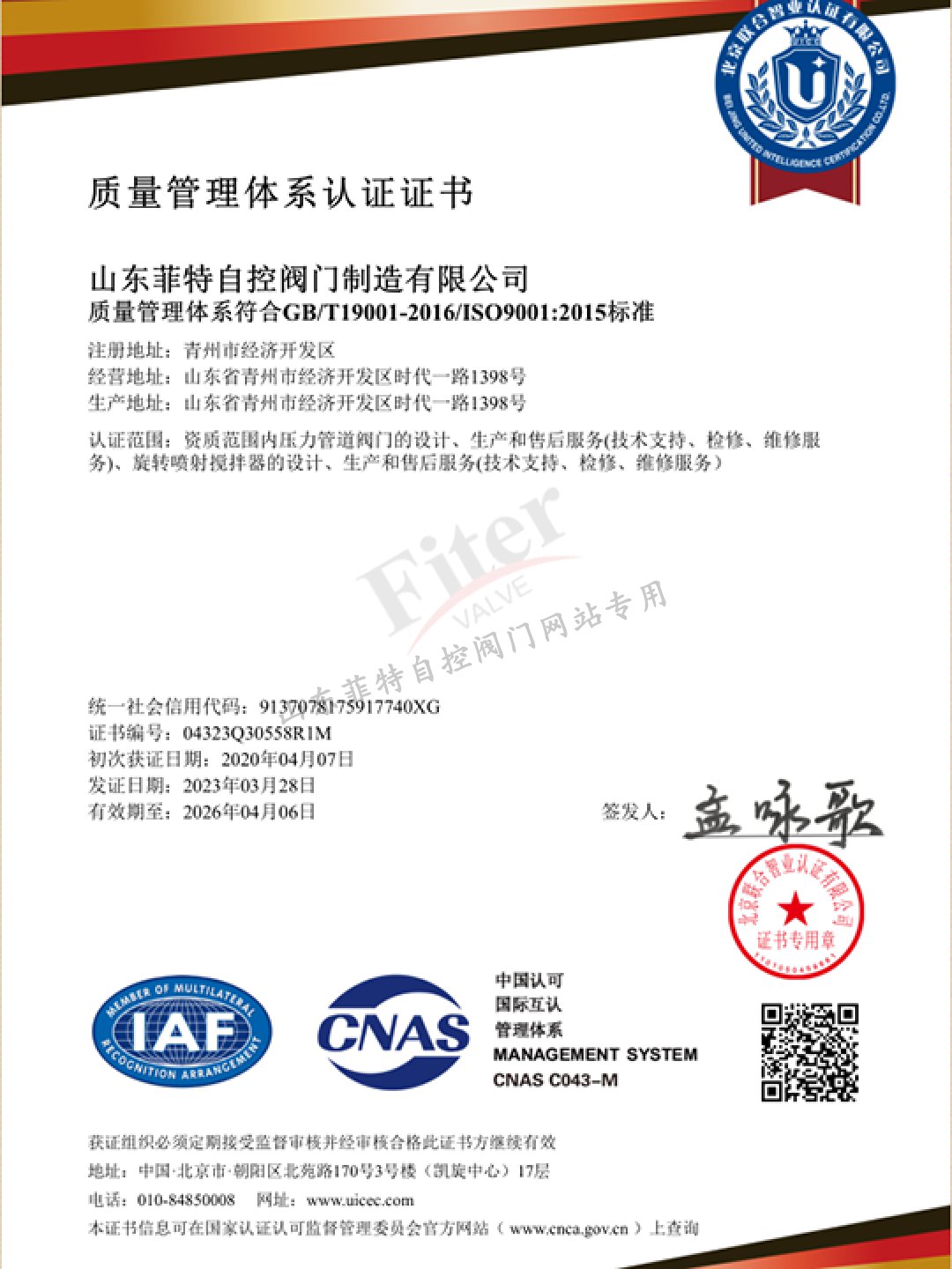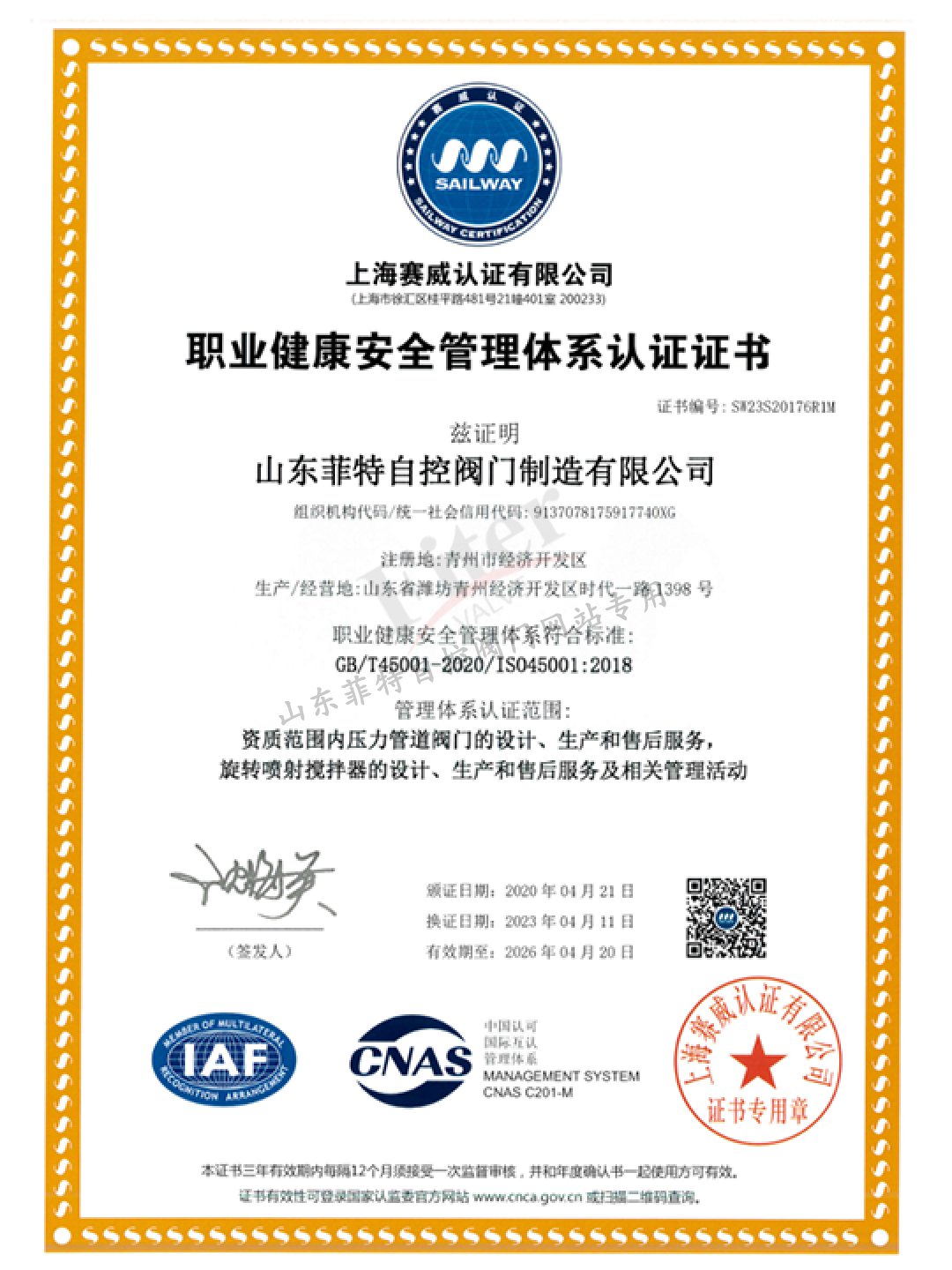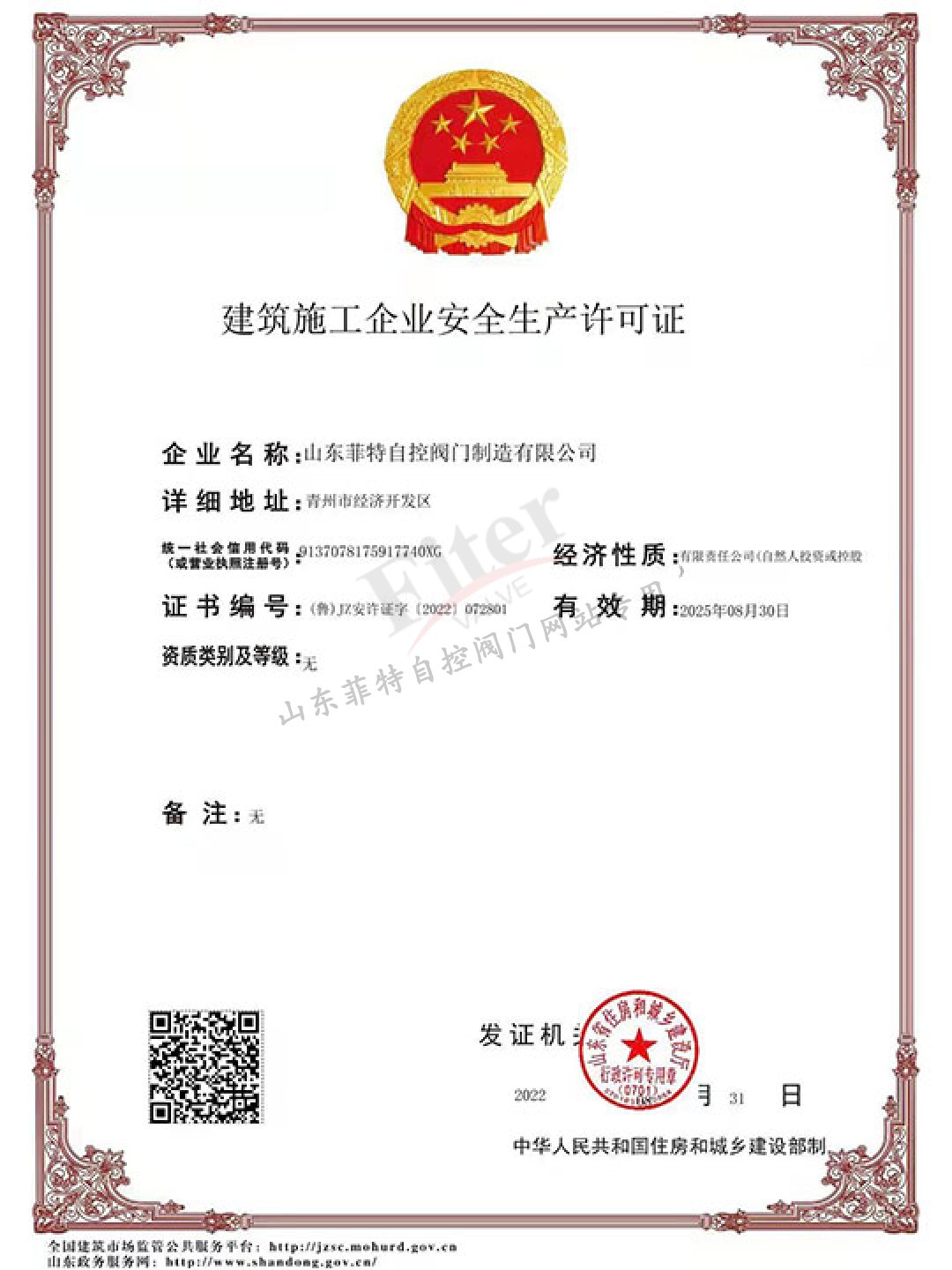 公司目前有30多項發明專利和實用新型專利,經過多年發展建立了一套完整的符合《特種設備生產和充裝單位許可規則》的壓力管道元件制造管理體系,并取得國家市場監管總局頒發的TS特種設備制造許可A1級證書,許可項目為調節閥、閘閥、球閥、排污閥、蝶閥。公司取得ISO9001質量管理體系認證,ISO14001&45001環境與職業健康安全體系認證。