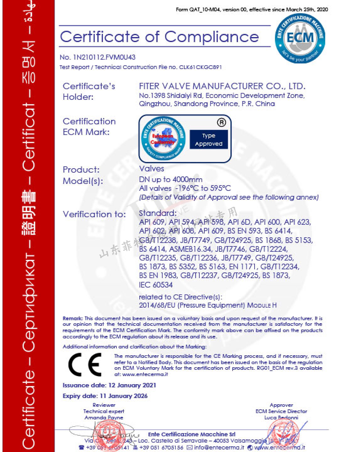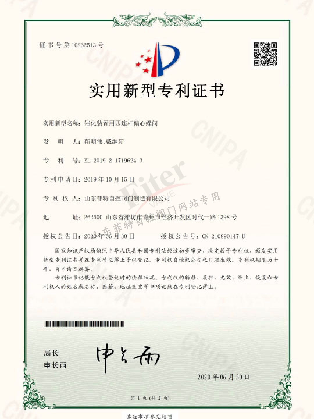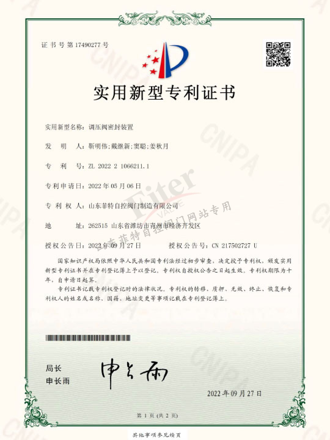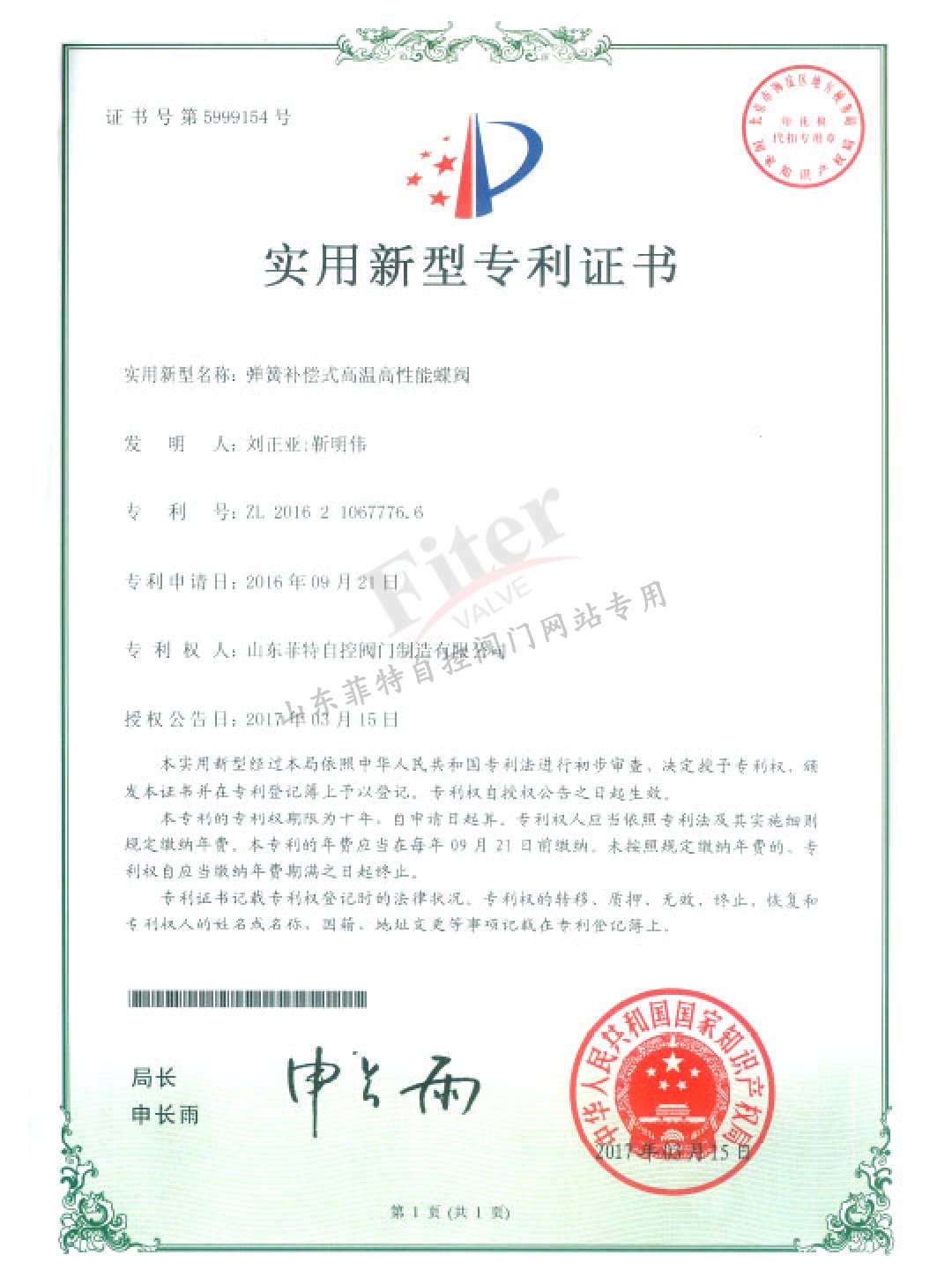 公司目前有30多項發明專利和實用新型專利,經過多年發展建立了一套完整的符合《特種設備生產和充裝單位許可規則》的壓力管道元件制造管理體系,并取得國家市場監管總局頒發的TS特種設備制造許可A1級證書,許可項目為調節閥、閘閥、球閥、排污閥、蝶閥。公司取得ISO9001質量管理體系認證,ISO14001&45001環境與職業健康安全體系認證。