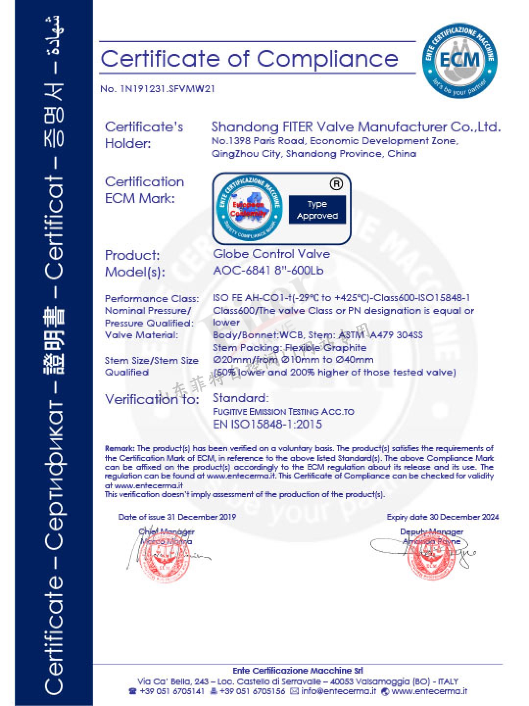 ISO 15848閥桿低泄漏認證證書