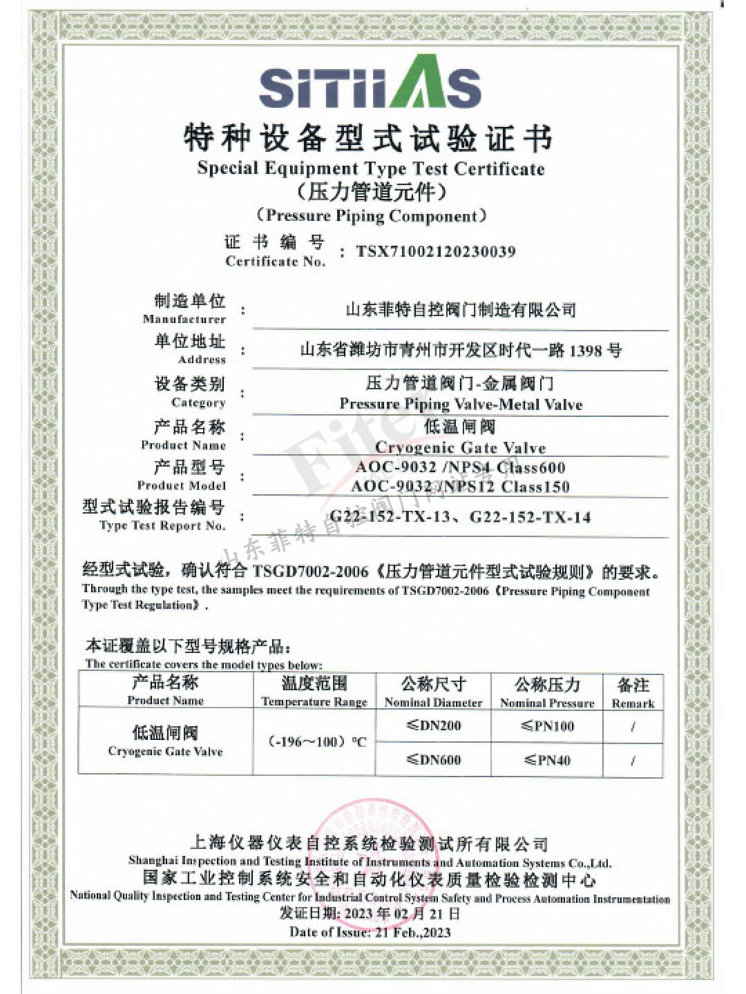 TS型式試驗證書-低溫閘閥