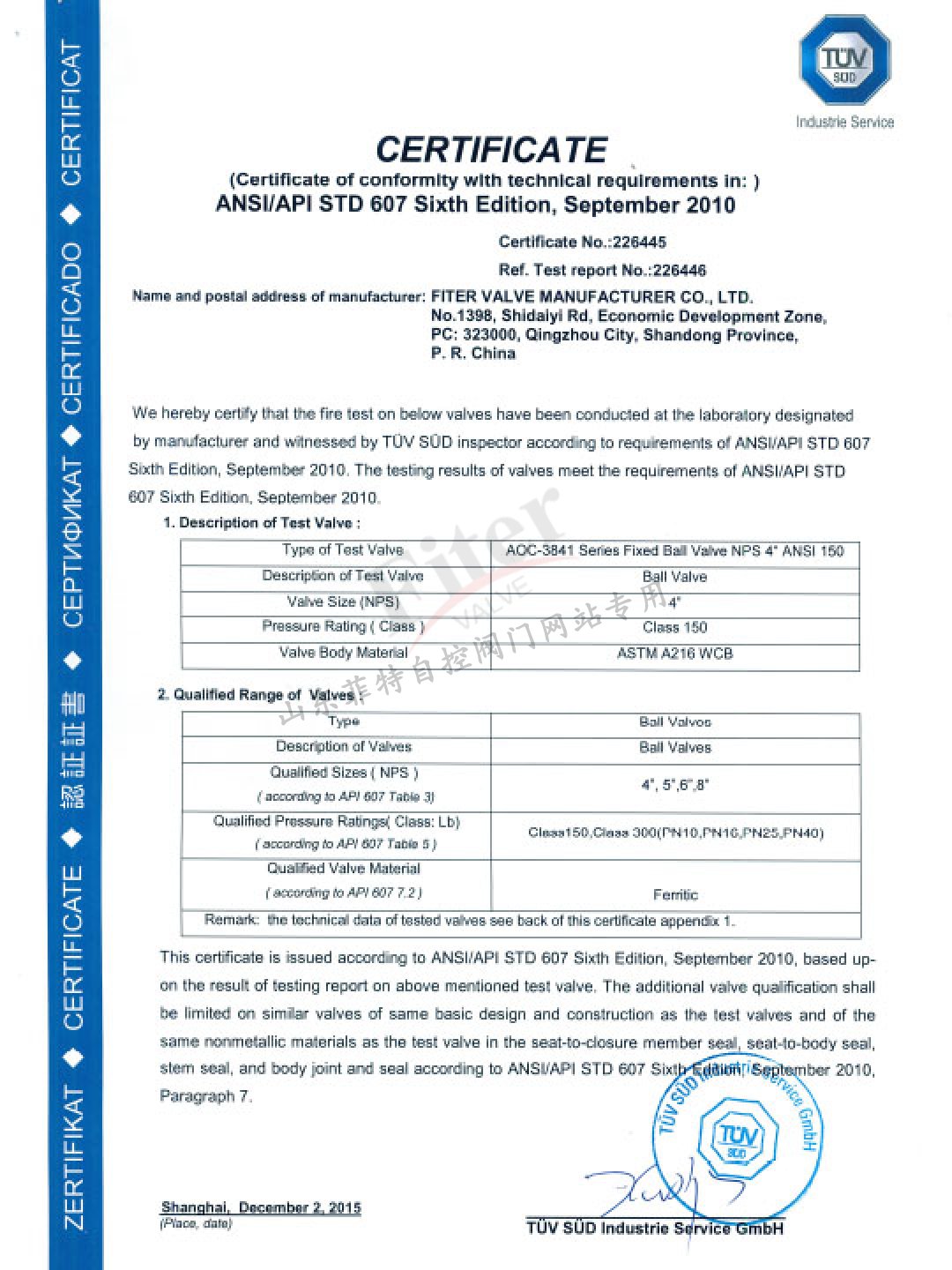 蝶閥API 607認證證書