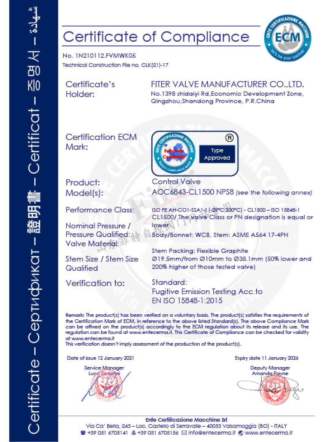 ISO15848閥桿低泄漏認證證書